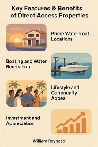 Direct access is where a property provides navigable waterway access to the Gulf of Mexico without any fixed bridge obstruction to further passage. It is a functional and economic consideration, particularly for boaters.