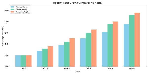 - Manatee Cove is showing reliable consistent growth, and by Year 6 this property will have risen to 128% of its value. These results demonstrate that reliable steady growth can be dashing for holding purposes, especially as compared to a less predictable environment.