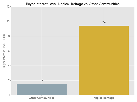 - Market Dominance: Naples Heritage shows an exceptional interest level score of $9.4$, significantly outpacing the baseline for Other Communities ($1.5$).