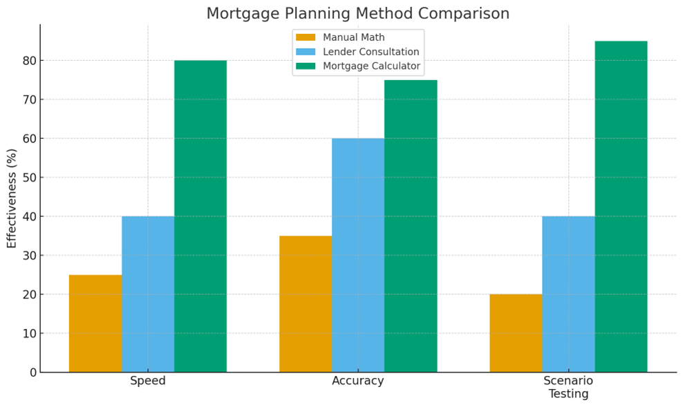 - Mortgage calculators outperform all other methods, offering the fastest speed, highest accuracy, and best scenario testing.