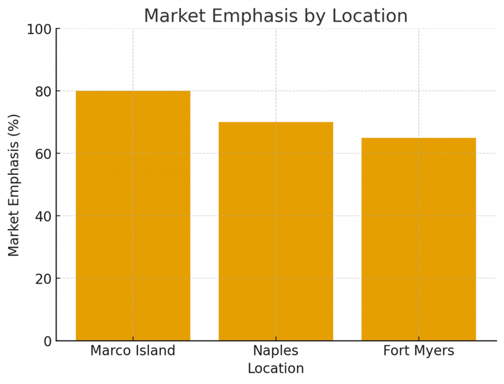 - The bar graph depicts Marco Island as having the most market emphasis (80% overall), reflecting a focus on waterfront and resort property.